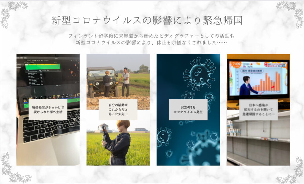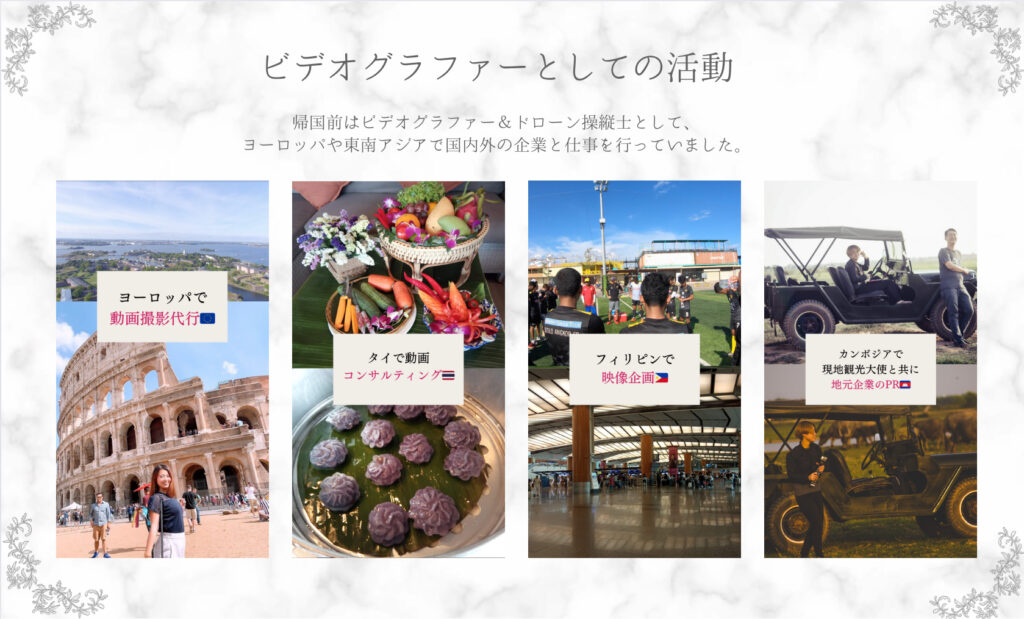 現地就職を探すも、現実的に厳しそうだったことから、手元にあったビデオカメラをどうにかできないか模索し、日本企業に問い合わせたことがきっかけで、未経験から、ビデオグラファー&ドローン操縦士として活動を開始。