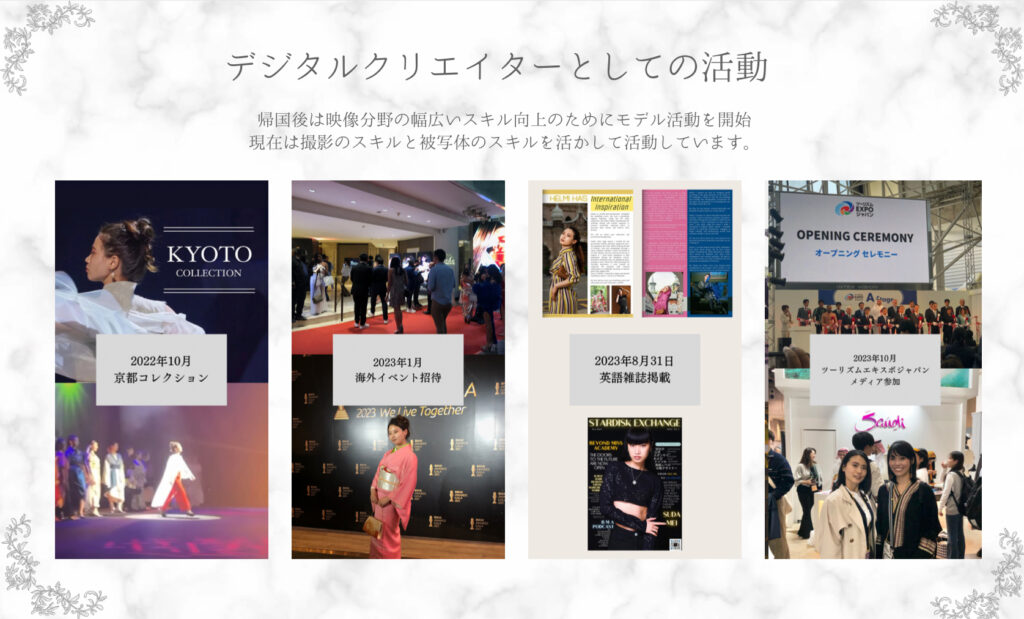 映像活動を再開する時に自分自身のスキルの限界を感じたことから、撮影以外の被写体としてのスキルを高めるために、モデルスクールに通う。その年の冬の時期に、海外渡航時代の電子書籍を出版。